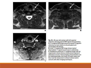 The parathyroid glands are located posterior to the thyroid gland in the neck. Parathyroid adenomas, the most common cause of primary hyperparathyroidism, enhance vividly on arterial phase CT then wash out rapidly on delayed phase with low attenuation on non-contrast images. Localizing the adenoma precisely with 4D CT guides focused surgical treatment through a small incision. The characteristic enhancement pattern and morphology help identify ectopic adenomas located during fetal development in the mediastinum.