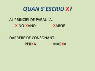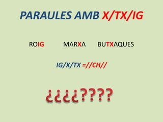 This document discusses Catalan spelling rules for the letter combinations X/TX/IG. It states that X is written at the beginning of words like "Xino-Xano" and "Xarop" or after consonants like in "Perxa" and "Marxa". TX is written between vowels as in "Caputxa" and "Dutxa", and sometimes at the end of words if derivatives also contain TX, like "Sanvitx". IG is written at the end of words if derivatives are spelled with G/J/TG/TJ, such as "Roig" and its derivative "Rogen".
