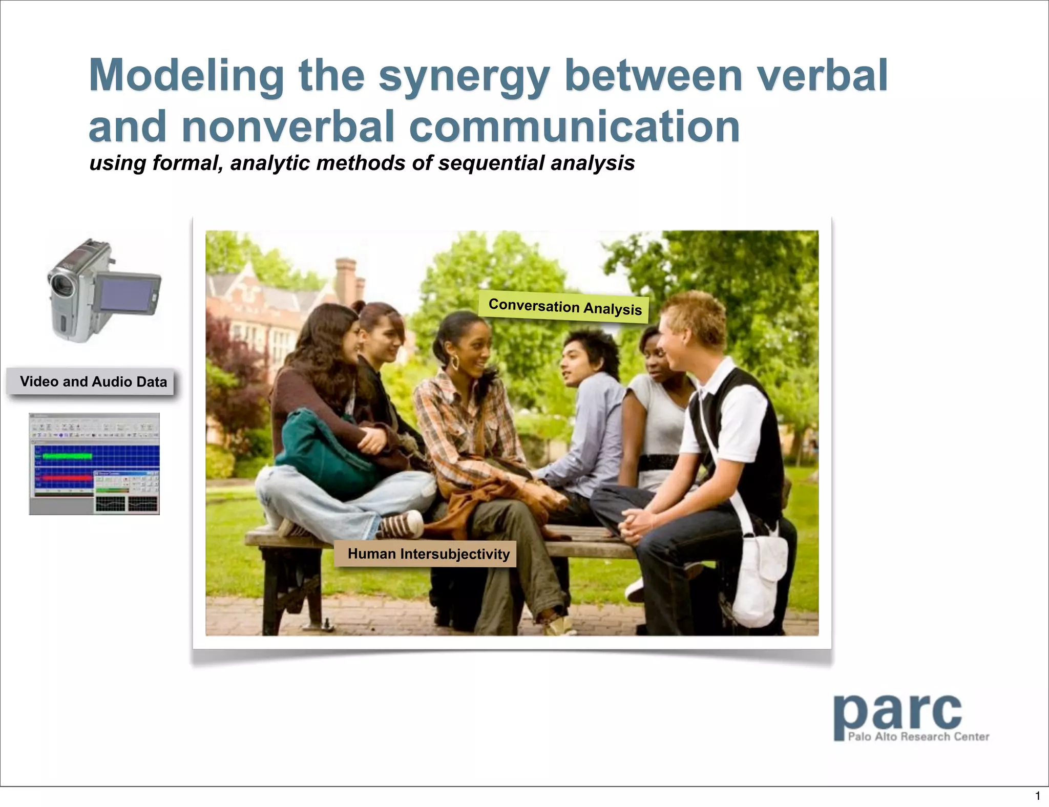 This document discusses modeling verbal and nonverbal communication using formal analytic methods. The research has two goals: 1) contribute to the science of human interaction and intersubjectivity, and 2) develop techniques for computers to detect states of intersubjectivity from video and audio data. It focuses on identifying the structure and sequence of implicit references, understanding, agreement, and sentiment between conversation participants. The approach analyzes video recordings to extract machine-perceivable cues that can detect these behaviors automatically.