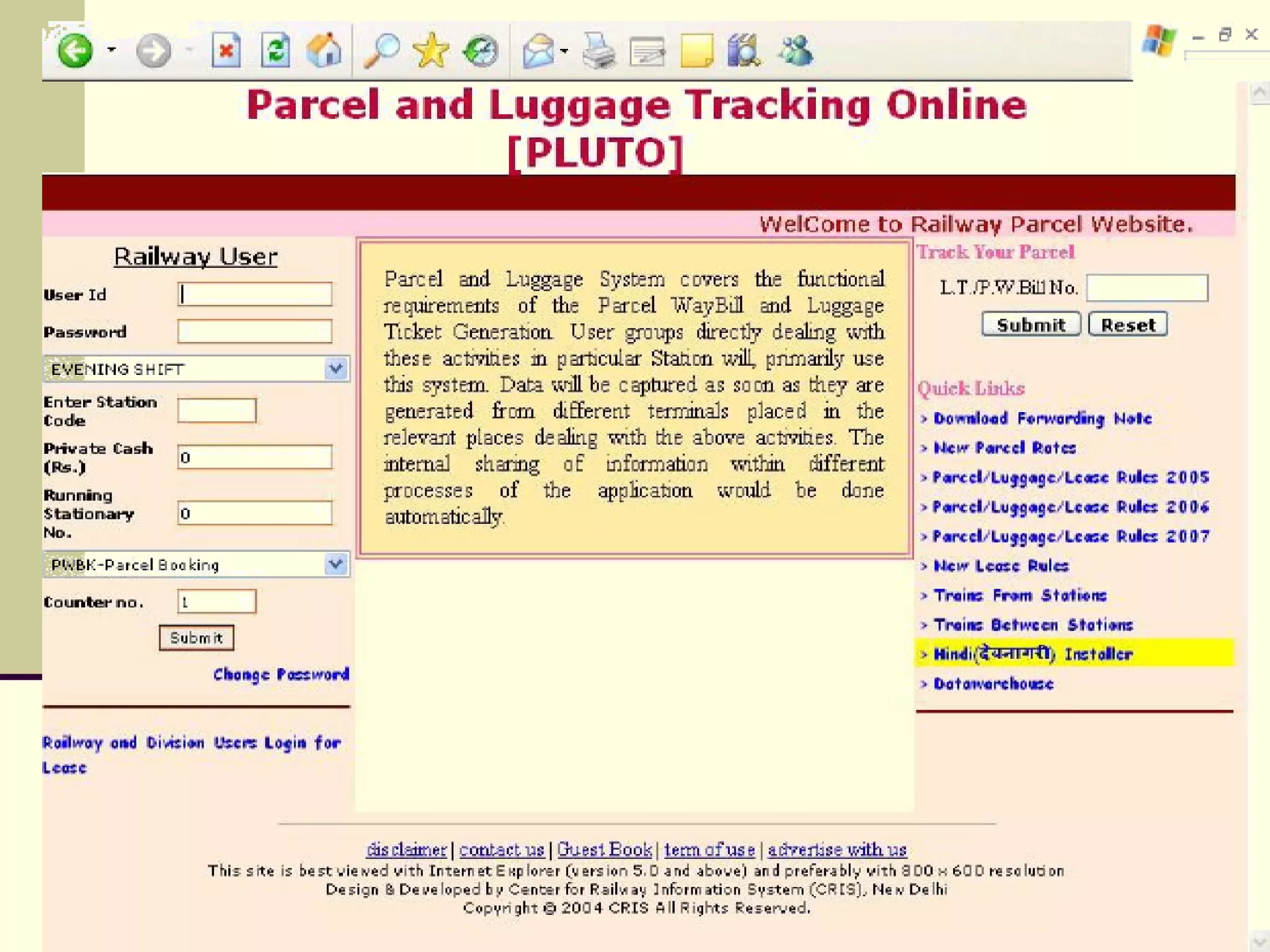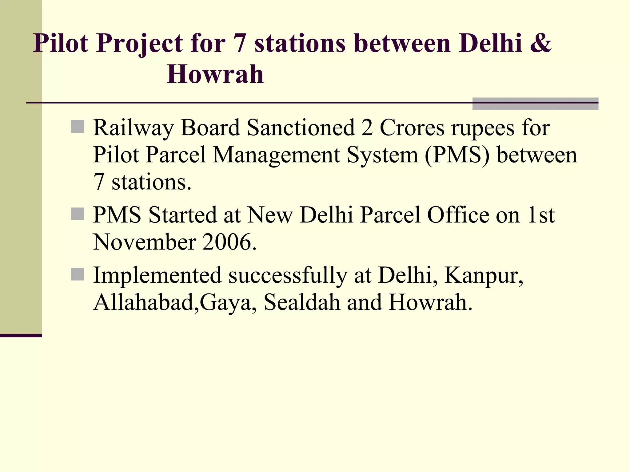 The document summarizes a pilot parcel management system (PMS) implemented between 7 stations in India from Delhi to Howrah. Key features of the PMS include direct electronic capture of parcel weights, single window for booking and payment, advance notification of incoming parcels, and tracking parcels using barcode technology. The system involves centralized servers, thin clients, electronic weighing machines, barcode printers, and wireless networking. The role of CRIS was to strengthen hardware and provide training, while railways identified stations and provided infrastructure support. Benefits included easier customer tracking, faster processing, reduced malpractices, and potential for revenue growth.