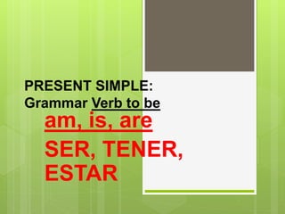 The document provides information on grammar structures for the present simple tense in English. It includes the verb "to be" in affirmative, negative, and interrogative forms for different subjects. Examples are given for subject pronouns and their uses with the present simple tense. Common questions asked in conversations are listed regarding name, age, location, occupation, marital status, and mood. Phrases for use in English classes are also included.