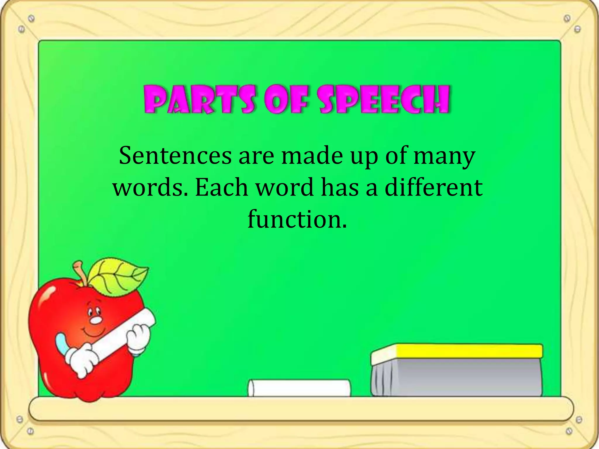 Sentences are composed of words that have different functions such as referring to people, places and things or describing people, places and things. Words are also used to refer to actions.