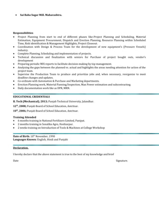 Pardeep Kumar Sharma is seeking assignments as a project engineer with experience in project management. He has over 2 years of experience spearheading projects with Spray Engineering Devices Ltd. He has strong skills in project planning, scheduling, material estimation, contract management, project execution, and maintenance. Some of the key projects he has worked on include projects in Dubai, Pakistan, and various sugar mills in India. He is competent in coordinating teams and ensuring projects are completed on schedule and within budget.