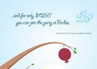Israel is celebrating its 62nd birthday this year. For $1250 instead of the usual $5750, people can join the celebration through a program at Pardes if they qualify for MASA. Additionally, people under 30 years old will receive a $150 birthday present on top of the discounted price of $1250. The document encourages doing the math to see the savings of the discounted birthday trip to Israel being offered by Pardes.