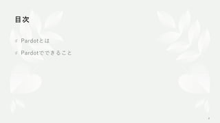 Pardotでできること(4) 見込み客を育てる スタティックリスト(静的リスト) ダイナミックリスト(動的リスト) ・作成すると空っぽリストができる ・手動やインポートによって自由にプロス ペクトを追加・削除できる ・作成すると指定した条件によって、プロ スペクトが自動的に追加・削除される →ユースケース: ・オートメーションルール等でプロスペク トを自動的に追加し、必ずしも自動で削除 しない ・特定のSalesforceキャンペーンのキャン ペーンメンバーをリストに追加 →ユースケース: ・条件に合致したプロスペクトを自動で追 加し、合致しなくなったプロスペクトを削 除する