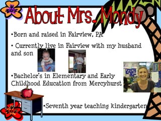 Mrs. Melissa Mondy teaches kindergarten at Fairview Elementary School. She has a bachelor's degree in elementary education and has been teaching for seven years. Her kindergarten classroom uses small group and individualized instruction, centers, and hands-on learning to teach literacy, math, and other subjects. Communication with parents includes agendas, newsletters, conferences, and a classroom website.