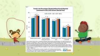 The document discusses the importance of parent involvement in promoting student achievement. It provides information from four credible sources that find parental involvement positively impacts students' academic performance, behavior, attendance, and social-emotional development. The sources outline how involvement can include parenting skills, communication, volunteering, learning at home, decision-making, and community collaboration. While parent involvement benefits students generally, the document notes some research questioning whether approaches are equally effective across all cultural and socioeconomic groups.