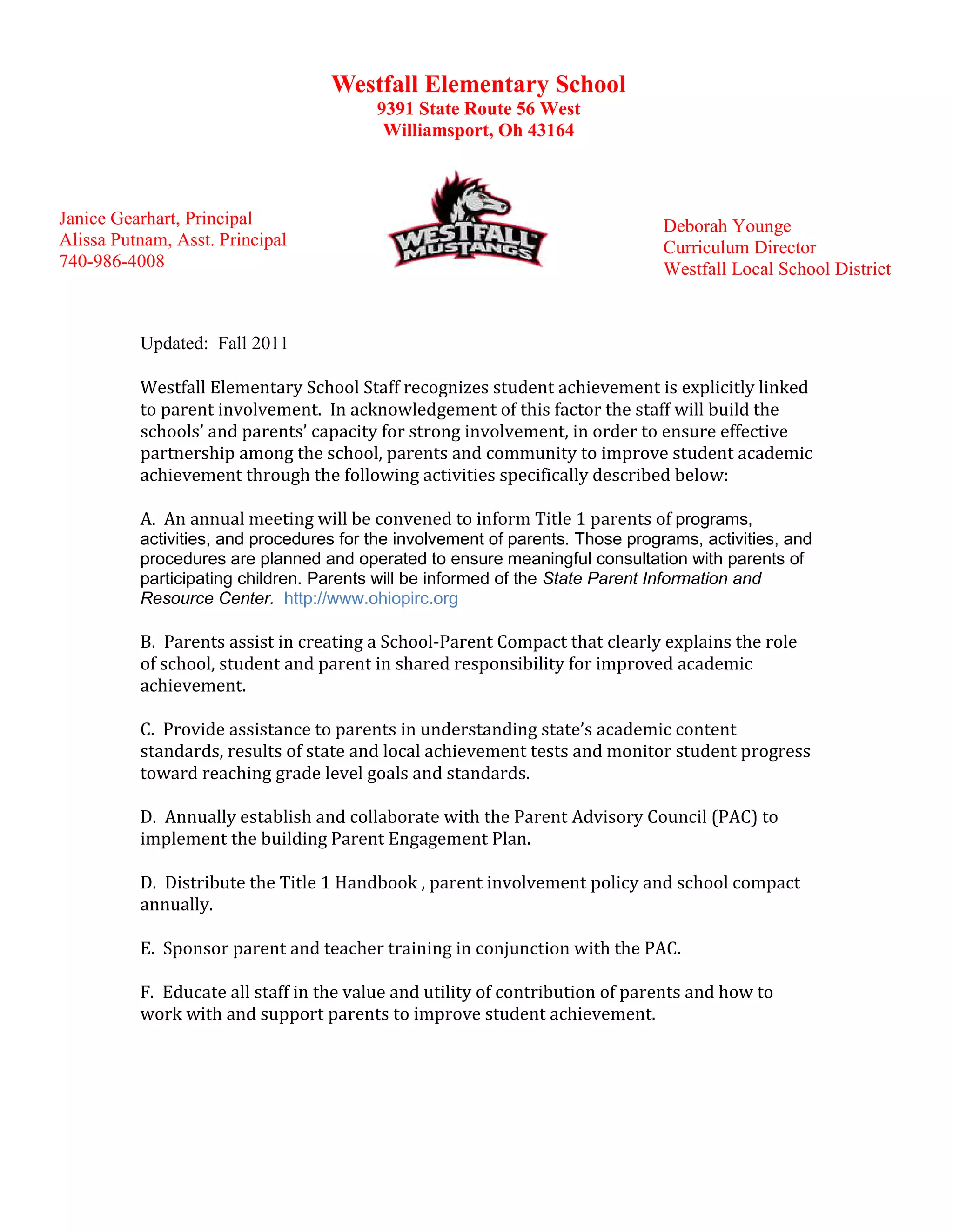 Westfall Elementary School recognizes that parent involvement is crucial to student achievement. The school will build the capacity for strong parent involvement through various activities and ensure effective partnership among the school, parents, and community. These activities include an annual Title I parent meeting, developing a school-parent compact, providing assistance to help parents understand academic standards and test results, establishing a Parent Advisory Council, and distributing parent involvement policies. The school will also involve parents in jointly developing the parent involvement policy through an annual meeting and staff training.