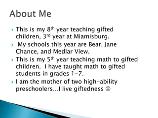 This open house presentation provides information about the gifted math program. The teacher has 8 years of experience teaching gifted students and teaches at 3 schools this year. Research shows that gifted math students enter already knowing 70% of the curriculum and learn more rapidly. In this program, students are assessed to determine their current knowledge and pace of learning. Past test results show that the majority of students scored in the advanced range.