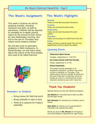 This newsletter provides information about upcoming events and assignments for the 3rd grade class of Ms. Mayo at Esther M. Sutton Academy. It includes details about science, math, and social studies lessons for the week, as well as reminders about bringing money for a field trip lunch and an umbrella. It also lists this week's homework assignments, highlights such as a classroom open house and ice cream social, and an upcoming school assembly where students can dress as storybook characters.