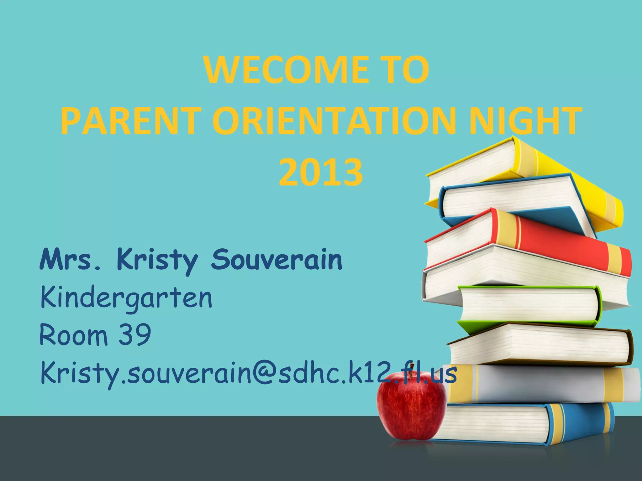 This document provides information from a Kindergarten orientation night for parents. It introduces the teacher, Mrs. Kristy Souverain, and outlines expectations and curriculum for students. Key topics covered include parent responsibilities, the Kindergarten schedule, focus areas in reading, writing, math, science and social studies. Assessment tools used are also listed. Parents are encouraged to read to their children, practice letters and sounds, and volunteer in the classroom.