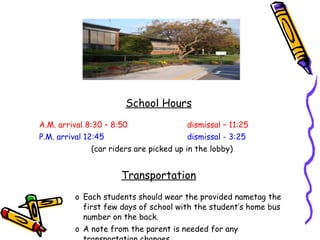This document provides information for parents about their child's kindergarten classroom. It outlines the school hours, transportation procedures, dress code, homework expectations, reporting schedules, holidays, field trips, volunteer opportunities, classroom procedures and expectations. Communication methods are also listed.