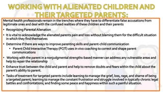 Parental alienation is a psychological manipulation process where a child is led to feel unwarranted hostility towards a parent, especially during family separation or divorce, constituting a form of child abuse. This abuse can have long-term emotional effects including poor self-esteem, substance abuse, and problems with social connections. The document also discusses factors contributing to parental alienation, the strategies used by alienating parents, and the need for increased awareness and understanding of this issue.
