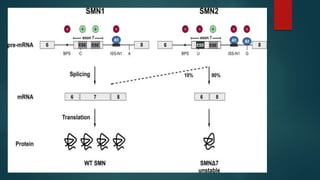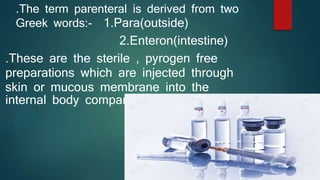 Parenterals are sterile preparations that are injected through the skin or mucous membranes into the body. They provide quick onset of action and accurate dosing but require aseptic technique. Common routes include intramuscular, intravenous, and subcutaneous. Advantages include rapid absorption but disadvantages include pain and risk of infection. The only approved treatment for spinal muscular atrophy (SMA) is the drug Spinraza, which works by binding to mRNA to make the SMN protein functional and treat SMA, an inherited neuromuscular disease. Future parenteral delivery systems aim to reduce injections and provide sustained drug release through methods like nanoparticles, in-situ forming depots, niosomes, and liposomes.