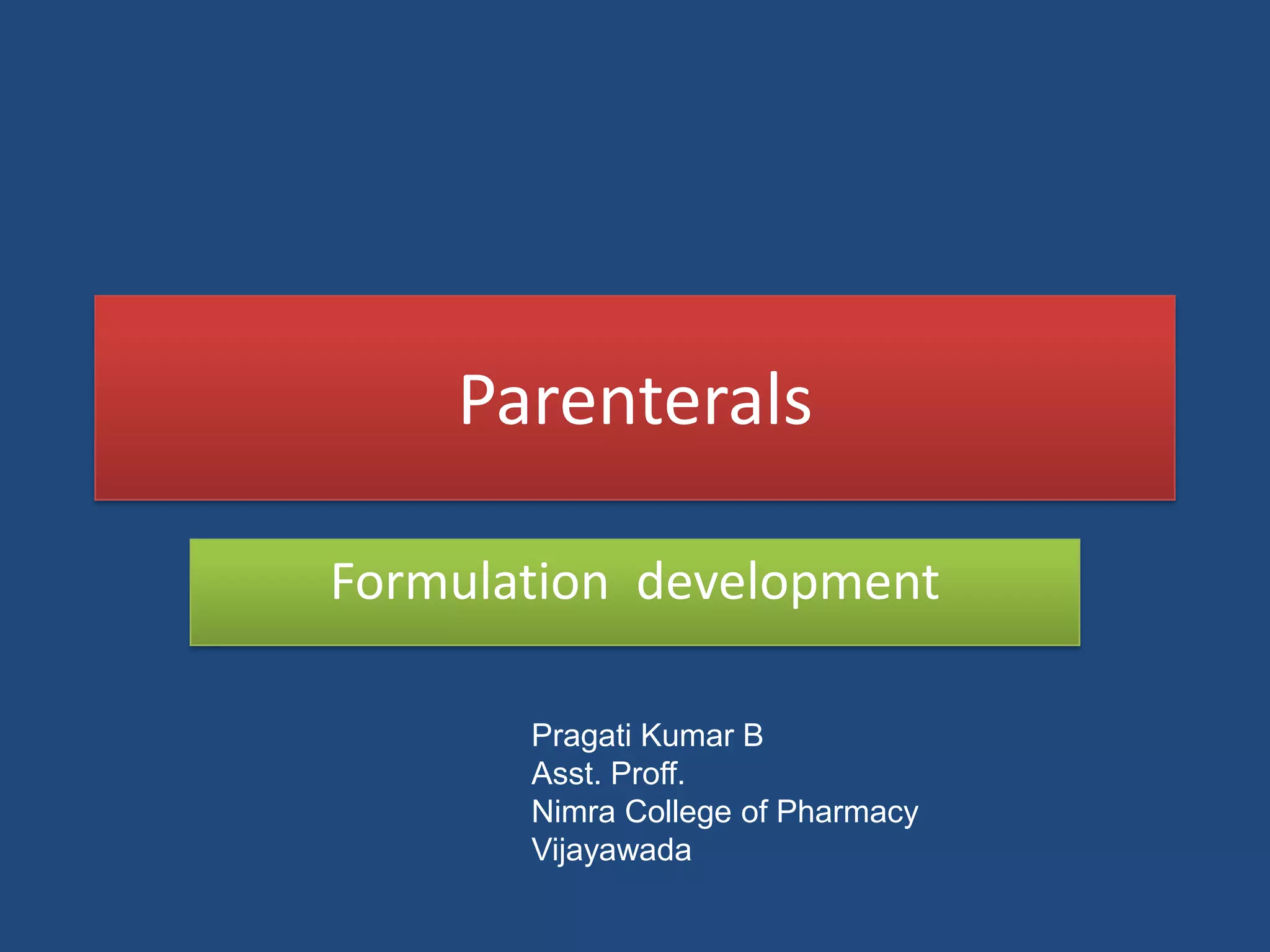 2) Key factors in formulating parenterals include the vehicle, drug volume, adjusting isotonicity and pH, inclusion of stabilizers and preservatives, and ensuring the appropriate concentration and osmotic pressure.
