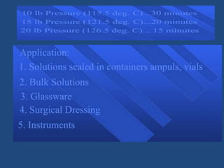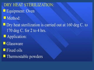 3) Sterilization of parenterals can be achieved through various moist heat methods like autoclaving, dry heat like oven sterilization, or chemical methods using gases like ethylene oxide.