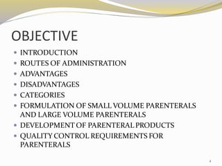 This document provides an overview of parenteral drug formulations and administration. It discusses the definition and routes of parenteral administration including intravenous, intramuscular, subcutaneous, and others. It covers the advantages and disadvantages of the parenteral route. The document categorizes parenteral formulations based on volume into small volume parenterals less than 100mL and large volume parenterals greater than 100mL. It describes the formulation, development, quality control testing, and administration of parenteral drug products.