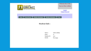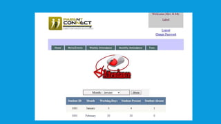 The document describes a student attendance tracking system called "Parents Connect". It allows staff to record student attendance daily and generates reports on weekly and monthly attendance. It aims to reduce paperwork and save time by automating attendance tracking and report generation. Key features include attendance tracking, report generation, and a portal for parents to monitor their child's attendance.