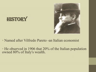 Pareto analysis is a statistical technique used to determine the few key causes that create the majority of problems. It separates the vital few causes from the trivial many. A Pareto chart arranges data in descending order of frequency or impact, with the largest categories on the left. This visualizes that 20% of causes often account for 80% of problems. The Pareto principle can be applied to problem solving, to-do lists, relationships, passions, and decluttering to focus on the most impactful 20% of tasks, people, or possessions.