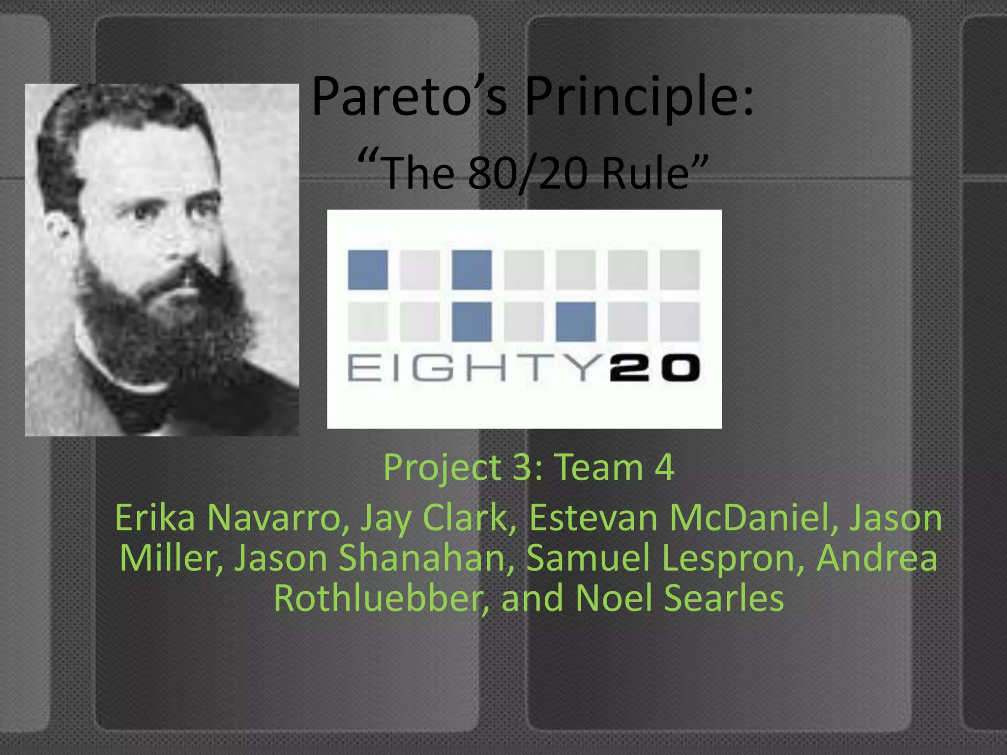 This document discusses the application of Pareto's Principle, also known as the 80/20 rule, to project management. It states that 20% of project work typically accounts for 80% of the time and resources. The document provides examples of how the 80/20 rule applies in other contexts like customer service, business activities, wealth distribution, and more. It also discusses using the principle to identify the most important 20% of tasks in a project in order to make efficient use of resources.