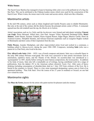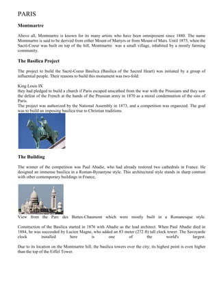 The document provides details about the history and sights of Montmartre in Paris, France. It describes how Montmartre was originally a small farming village that became a center for artists in the late 19th century. It summarizes the construction of the Sacré-Coeur Basilica between 1876-1919 to fulfill a pledge to build a church if Paris was spared from war. Finally, it lists many famous artists and performers who lived and worked in Montmartre, as well as current attractions, including the Moulin de la Galette, Dalí and Picasso museums, and streets and neighborhoods of historical significance.