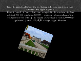 Paris is the capital and largest city of France, located on the river Seine in northern France. It has over 2 million residents within city limits and over 12 million in the surrounding suburbs, making it one of the most densely populated metropolitan areas in Europe. Paris became a major cultural and educational center in the 12th century and was one of Europe's largest cities by the 18th century. Today it remains an important global center for business, education, culture, science, and politics.