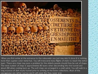 The document describes the Catacombs of Paris, a lesser-known attraction filled with the remains of 5 to 6 million people. It details the history of the catacombs, their construction to alleviate overcrowded cemeteries, and the eerie arrangement of bones within the tunnels. The text also notes the complex, extensive underground network and the restrictions on accessing the catacombs without an official guide.