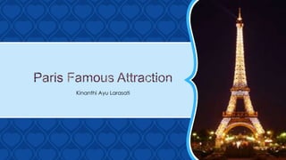 The document provides information about three famous attractions in Paris: the Eiffel Tower, Arc de Triomphe, and Louvre Museum. It describes the Eiffel Tower as an 985 foot tall monument built in 1889 by Gustave Eiffel using his own money. The Arc de Triomphe is a 162 foot tall arch designed in 1806-1836 containing the Tomb of the Unknown Soldier. The Louvre Museum houses famous works like the Mona Lisa and has around 35,000 paintings and statues.