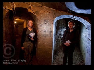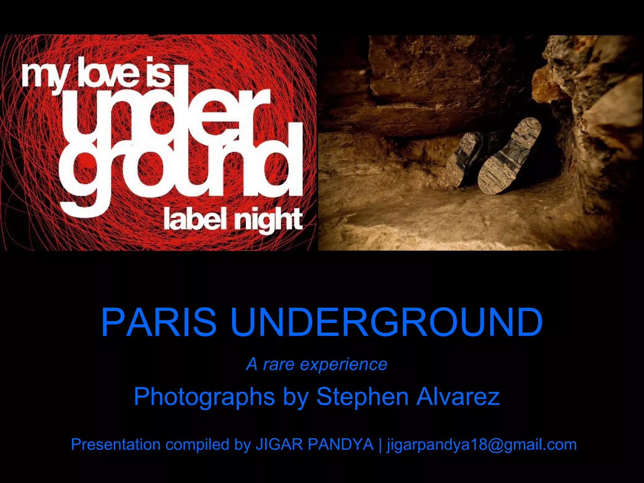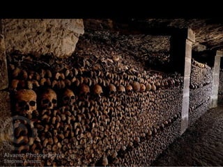 Photographer Stephen Alvarez captures the intricate underground world of Paris, including catacombs that house millions of bodies and hidden tunnels frequented by 'cataphiles'—explorers who engage in various activities from partying to painting. The document explores the contrast between legally accessible sites like the catacombs and illegal exploration of forgotten tunnels, highlighting the vibrant culture and art created by those who venture underground. It emphasizes the community's spirit and the unique experiences of nighttime festivities in this subterranean realm.