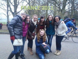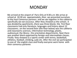The document summarizes the activities of a school group from France during a 2011 trip to Paris. On Monday they arrived at the airport and visited their partner school, seeing classrooms, cafeteria, sports facilities and participating in an English class. On Tuesday they went to Paris, visiting perfume and fashion museums, took a boat tour on the Seine river seeing landmarks, and visited the Eiffel Tower. On Wednesday they visited a pastry school and hotelier school, eating lunch served by students. On Thursday they spent the day in Versailles, seeing gardens, having lunch, buying souvenirs, and touring part of the castle before returning home tired after a long day.