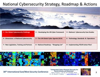 The document outlines a national cybersecurity strategy and action plan presented at the 30th International East/West Security Conference in Paris in 2014. It focuses on the global cybersecurity challenges, the development of a UN cyber framework, national case studies, and the need for integrated cyber-physical security for governments and businesses. It emphasizes new legislation, training, partnerships, and the implementation of a national roadmap for enhancing cybersecurity efforts.