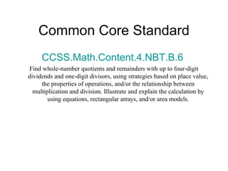 This document discusses the partial quotients method for long division of whole numbers. It provides an example of dividing 177 by 8 using partial quotients. The divisor (8) is broken into "partial quotients" of 10, 10, and 2, which are multiplied and subtracted until the remainder is reached. The summary explains that different partial quotients could have been chosen, and picking ones closer to the final answer would solve it in fewer steps. It also shows an alternate way to solve the same problem using an initial partial quotient of 20.