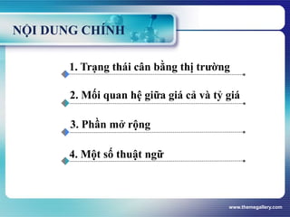 Tài liệu phân tích mối quan hệ giữa tỷ giá và giá cả thông qua các khái niệm như quy luật một giá (Lop) và ngang bằng sức mua (PPP). Nó trình bày các giả định về thị trường cạnh tranh hoàn hảo, các yếu tố ảnh hưởng đến tỷ giá hối đoái, và việc ứng dụng PPP trong thực tế tại Việt Nam. Ngoài ra, tài liệu còn xét đến tình hình thực tế và quản lý tỷ giá ở Việt Nam trong bối cảnh kinh tế toàn cầu.