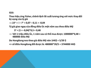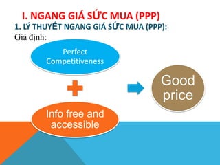 Tài liệu đề cập đến lý thuyết ngang giá sức mua (PPP) và ngang giá lãi suất (IRP), cùng với các chỉ số tỷ giá thực và danh nghĩa, cũng như ảnh hưởng của chúng đến cán cân thương mại và đầu tư quốc tế. Nghiên cứu phân tích mối quan hệ giữa tỷ giá và lãi suất, cũng như các phương pháp kinh doanh chênh lệch giá cả trong môi trường tài chính hoàn hảo. Ngoài ra, tài liệu còn nêu rõ các yếu tố ảnh hưởng đến tỷ giá và cách thị trường điều chỉnh để duy trì sự cân bằng trong dài hạn.