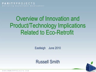 ![The viscious cycle of impedance Logistics focussed products will win out Raise the awareness of the whole supply chain Common language to unlock success Summary [email_address] 0208 643 6630 www.parityprojects.com Demo House Open Days Next - Sat 24 th July [email_address]](https://image.slidesharecdn.com/parityprojects-russellsmith-100705074946-phpapp01/85/Overview-of-Innovation-and-Product-Technology-Implications-Related-to-Eco-Retrofit-Russell-Smith-Parity-Projects-21-320.jpg)