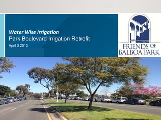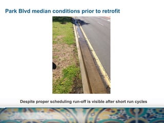 This document summarizes an irrigation retrofit project along Park Boulevard medians in San Diego. A team replaced existing spray nozzles with MP Rotator nozzles to reduce irrigation runoff. The new nozzles apply water at a slower half-inch per hour rate compared to the 2+ inches from the spray nozzles. This allows water to soak into the soil rather than run off. An audit after installation found lower application rates and more uniform coverage with the rotators. Runoff was eliminated, saving an estimated 20% of water usage. The retrofit improved landscape health with no pooling or runoff.