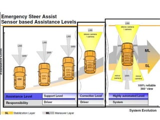 The document discusses park assist and crash assist systems for vehicles. It describes the components of a park pilot assist system, which uses ultrasonic sensors and an ECU to calculate distances to obstacles and help guide reversing. It also covers two pre-crash assist systems: a collision mitigation braking system that predicts rear-end collisions and applies brakes; and a predictive emergency braking system that uses sensors like steering angle and wheel speed to detect when emergency braking is needed and assist the driver.
