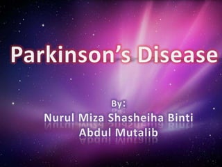 Parkinson's disease is a progressive nervous system disorder that results from the loss of dopamine-producing neurons in the substantia nigra. It is characterized by tremors, stiffness, and slow movement. Approximately 1 in 100 people over 60 are affected, with 1.5 million cases in the United States where 58% are men. While there is no cure, treatment focuses on replenishing dopamine levels through levodopa/carbidopa drugs and potentially surgery.