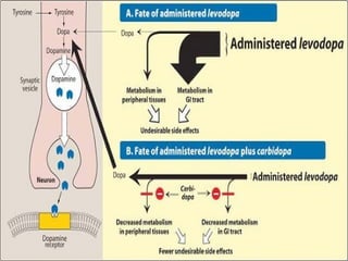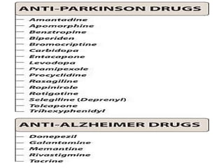 Parkinsonism is a progressive neurological disorder characterized by bradykinesia, muscular rigidity, resting tremor, and impaired balance. It can be caused by idiopathic Parkinson's disease, vascular issues, certain drugs that block dopamine, or dementia with Lewy bodies. Treatment aims to increase dopamine in the brain and involves levodopa, dopamine agonists, MAO inhibitors, COMT inhibitors, amantadine, and anticholinergic drugs.