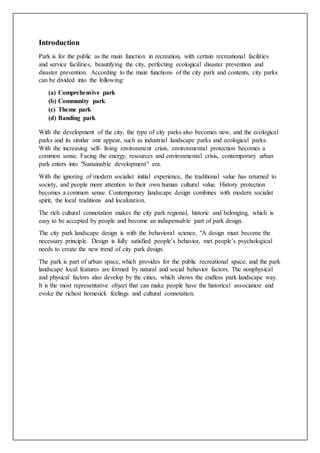 The document provides details about the Buddha Jayanti Park in Delhi, India. It was designed in 1957 to celebrate 2500 years of Buddha's enlightenment. Prime Minister Nehru selected the design by Mansingh Rana, which featured undulating green slopes and meandering streams for a peaceful environment reflecting Buddha's life. Influenced by Japanese zen gardens, Rana included concrete bridges and focused on landscape elements over greenery. Though maintenance has reduced streams and lakes, the park still offers visitors respite in its lyricism and grounded quality reflecting Buddhist teachings.