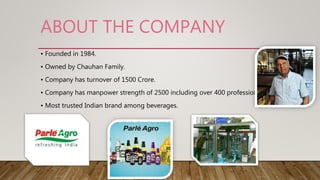 Parle Agro is an Indian company founded in 1984 that owns popular beverage brands like Frooti, Appy, and Bailley water. It has a turnover of 1500 Crore and employs 2500 people. The company operates in the beverages, water, and food categories. It faces competition from brands like Maaza, Slice, Tropicana, and Dabur Real Fruit Juice in the beverage market. Parle Agro's micro-environment includes suppliers, customer tastes, competitors, and market intermediaries that directly impact the business.