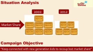 The document presents a marketing campaign analysis from 2002 to 2012. The campaign objective was to reconnect with new generations of kids and regain lost market share. The communication objectives were to build relationships, engage in online activities, and reach out to parents and children. The strategy involved using a voice that appeals to children, assessing parents' views, and providing helpful information. The campaign achieved over 1 million impressions online and nearly 100,000 engagements across social media and the brand's website.