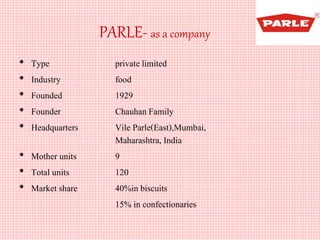 Parle is a private limited company founded in 1929, headquartered in Vile Parle, Mumbai, with a significant market share in biscuits and confectionaries. The company focuses on quality and nutrition, offering a variety of products consumed across all demographics in India and expanding into international markets. Parle is committed to training, welfare activities, and community engagement while facing challenges such as product damage during delivery and competition from cheaper alternatives.