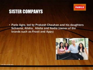 This document summarizes information about Parle products company. It discusses that Parle was founded in 1929 in Mumbai as a confectionery company. It later expanded into biscuits in 1939. Parle is now split into three separate companies - Parle, Parle Products, and Parle Agro. The core values of the company are understanding consumer needs and preferences and providing affordable, high quality products. Major Parle products include Parle-G biscuits, confectioneries like Melody and Poppins, and snacks. The document outlines Parle's production process and machinery used like mixers, moulders, and wrapping equipment. It concludes that over the years Parle has grown to become a multi-million dollar