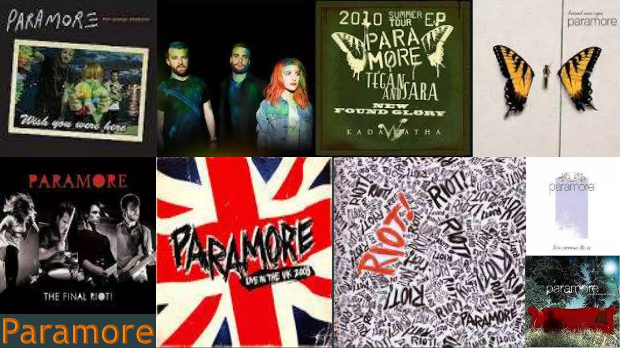 The album covers of the band Paramore have a consistent color scheme using dull colors like black, white and greys along with touches of orange, green, and red. This consistent color scheme makes their album artwork unique and helps develop their brand identity. Their website also uses this same color scheme, linking the imagery on the albums to that on the website. The website provides access to their discography and information about the band members while further enhancing their brand through the matching visual style.