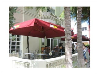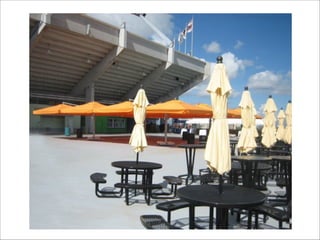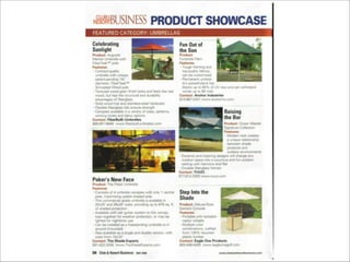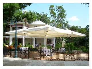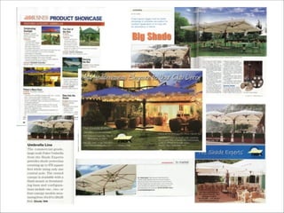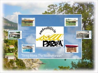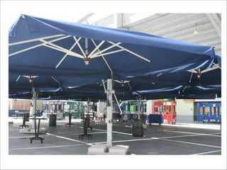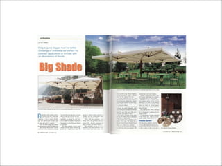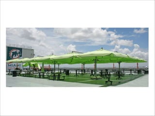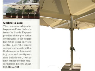 This document provides information about large commercial-grade umbrellas made by Parola USA. It describes their largest umbrella model, consisting of four canopies on a single central pole that provides up to 676 square feet of shaded area. The umbrellas are made of heavy-duty steel construction in Italy and come in various sizes and styles, including wood or aluminum poles. Parola USA is based in Florida and provides umbrellas for commercial settings like restaurants and clubs throughout the United States.