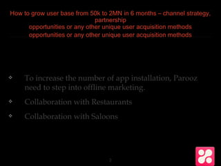 The Parooz app team outlines a strategy to grow its user base from 50,000 to 2 million in six months through offline marketing, collaborations with restaurants and salons, and unique user acquisition methods such as offering complimentary Wi-Fi and discount coupons. The strategy also includes customer retention measures, such as offering premium accounts regularly, gender mix improvement tactics, and safety features like a warning button for girls. Additionally, enhancing social media presence, SEO, and content marketing are emphasized to increase visibility and engagement.