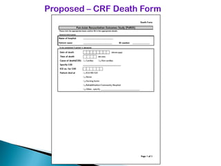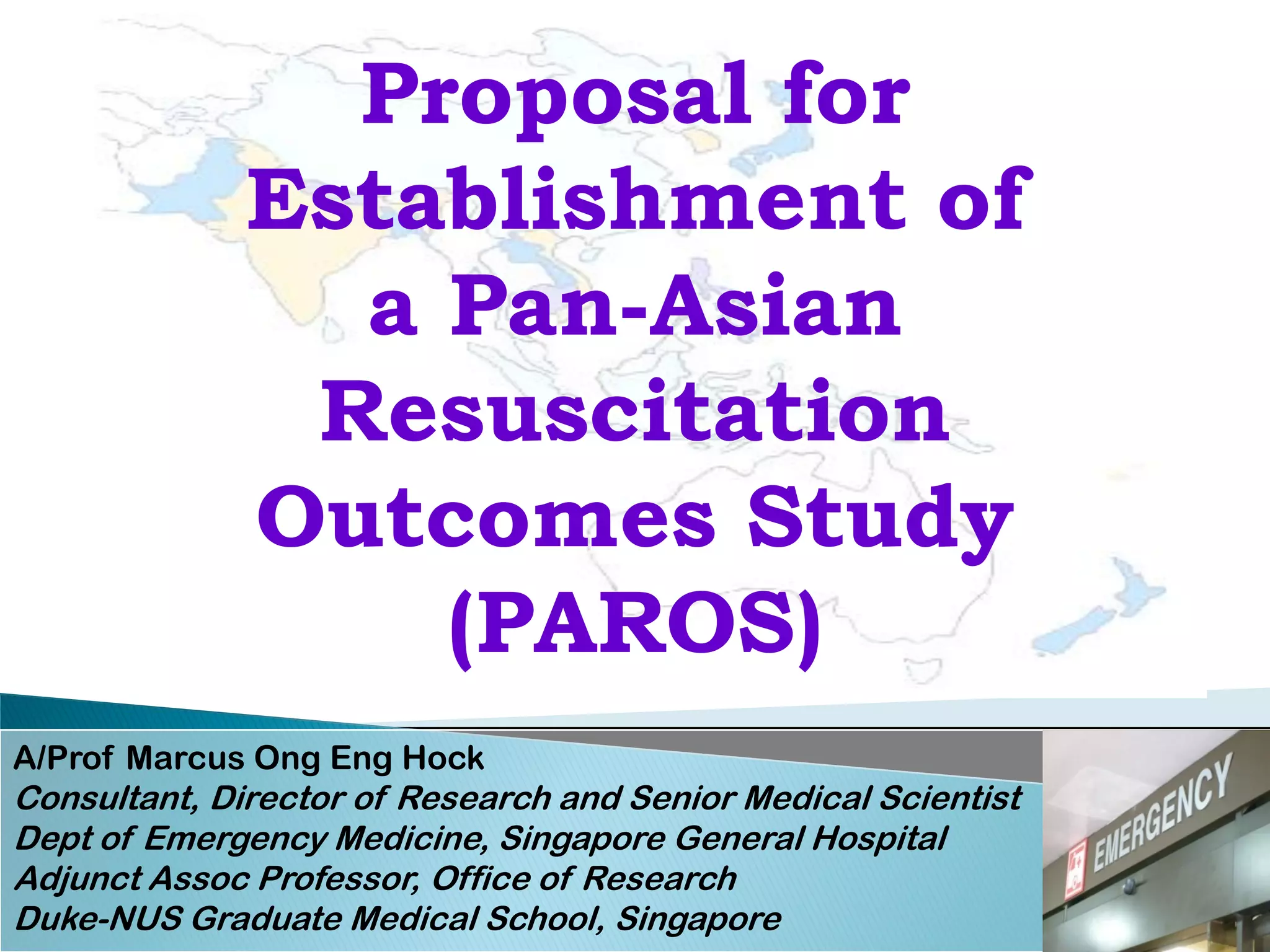This document proposes establishing the Pan-Asian Resuscitation Outcomes Study (PAROS) to track out-of-hospital cardiac arrest across Asia. It would collect data on incidence, outcomes, and emergency medical systems from multiple countries to allow for comparisons and identify best practices. The study would be modeled after the Cardiac Arrest and Resuscitation Epidemiology study in Singapore and involve over 13,000 cases collected electronically using common definitions and procedures. Participating countries would study populations totaling over 100 million people. The goal is to understand and improve resuscitation systems to reduce deaths from out-of-hospital cardiac arrest across the region.