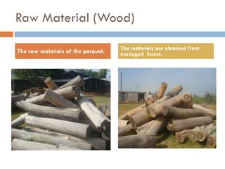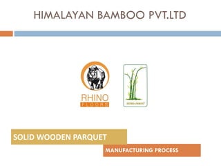 The document outlines the manufacturing process for solid wooden parquet flooring used by Himalayan Bamboo Pvt. Ltd. The process involves obtaining raw wood materials from managed forests, sizing and seasoning the wood using kiln drying, planning and shaping the wood with tongue and groove joints, sanding and applying polyurethane and UV coatings, implementing quality control checks, packaging, and making the final product available for homes.