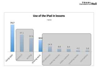 The document summarizes research from a study on iPad implementation across several schools in Scotland. It utilized mixed qualitative and quantitative methods including surveys, interviews, and observations. Key findings include: 1) Teaching and learning was fundamentally changed with students having personal access to iPads, allowing for more independent and collaborative work. 2) Parental engagement and interest in their child's learning increased. 3) School leadership emphasized the importance of robust WiFi infrastructure and patterns of personal device ownership for success.